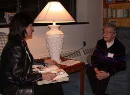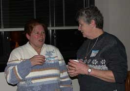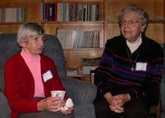 On the left, Patricia Lynn Reilly listens intently as Sr. Vincentia recalled her time spent as the Sr. Boys Cottage house mother before Sr. Francis. On the right, Joan McFarlane talks about the Village with Sr. Blanche Marie (Joan Tresch).