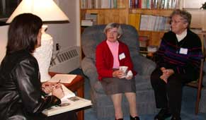 On the left, Joan McFarlane takes a moment from viewing the sisters anniversary book that featured a two page spread about the Village to talk with Sr. Geraldine Flannery and Sr. Blanche Marie (Joan Tresch).
