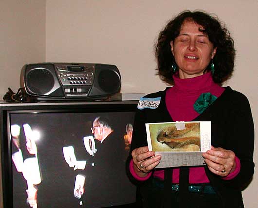 After the screening of the film, Patricia Lynn Reilly, who co-starred in the film along side John O'Connor as two "typicial" Village children, spoke of her experiences at the Village and the fun they had making the movie. Patricia recalled siting at a table having dinner in one scene and how she and John looked at each other and seemed to agree without saying much that this scene is so foney it wasn't even the cafeteria where the children ate, it was a fancier dining room in the convent. This film was the beginning of their long agenda of fundraising activities that they and many of the othere children would be pressed into service for. Seen here, patricia reads a most enspiring card sent to her. Patricia is sending us a copy of the text on the card and some information about it which we will print here. (Since then we regretably have not received the text.)