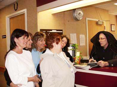 "Sr. James, Mother Superior" welcomes the group of newly arriving "children" to St. Joseph's Village as was once depicted on the front cover of the Village brochure. Here at the reception counter in the Administration Building, Jim Brown our website publisher and reunion weekend coordinator wore his jacket like a nun's habit to playout the running joke of the reunion weekend that he is now the current mother superior of St. Joseph's Village as it still exists today in cyberspace. The reception area underwent much remodeling to suit the needs of the Bergen County Health Care Center, but the camera angle is the same as it was in the 1958 brochure picture.