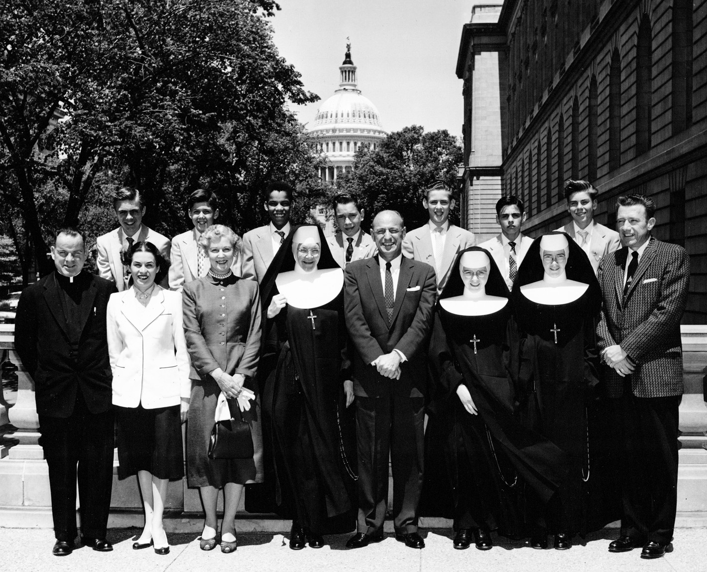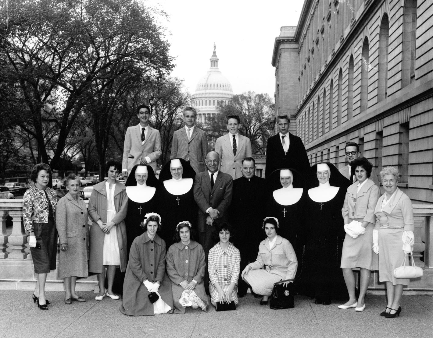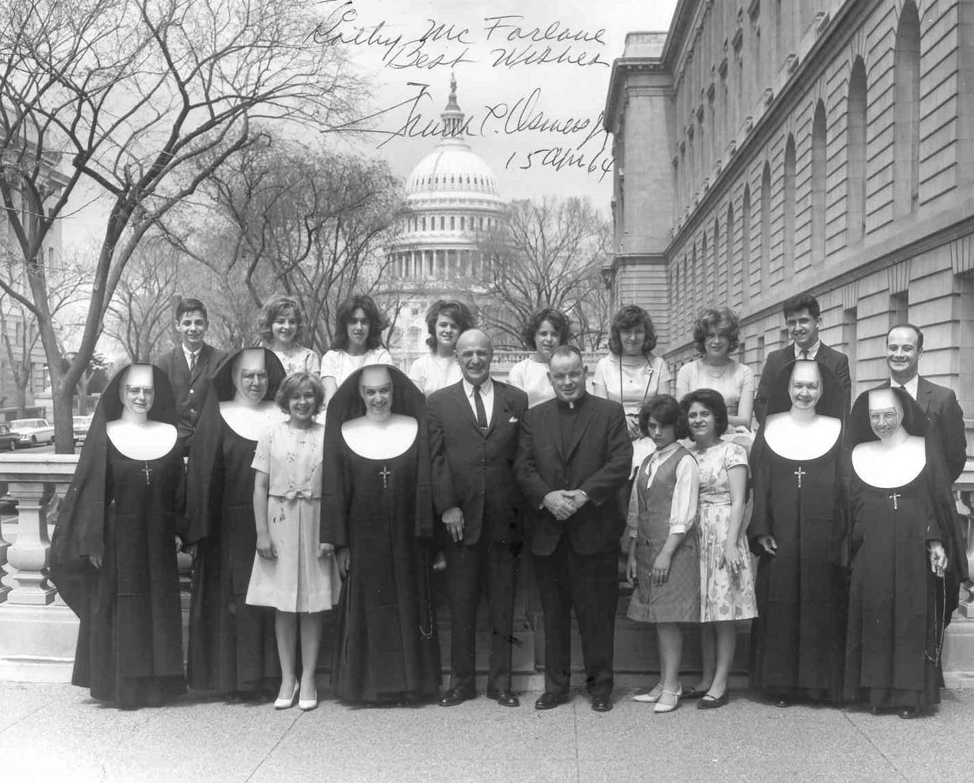 The 1960 graduates pose on the steps of the Nation's Capitol with Congressman Frank C. Osmers, Jr., of Tenafly. Pictured with the graduates and Osmers are Fr. George E. Byrne, four of the sisters, and Mrs. Henry J. Acanfora and Mrs. Theodore Farinella, who both were leaders in the St. Joseph's Guild.