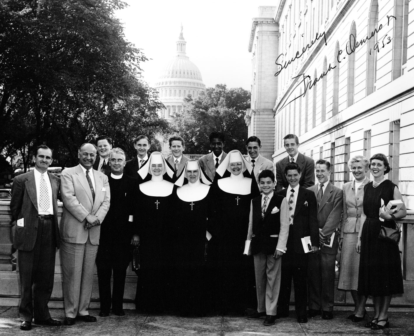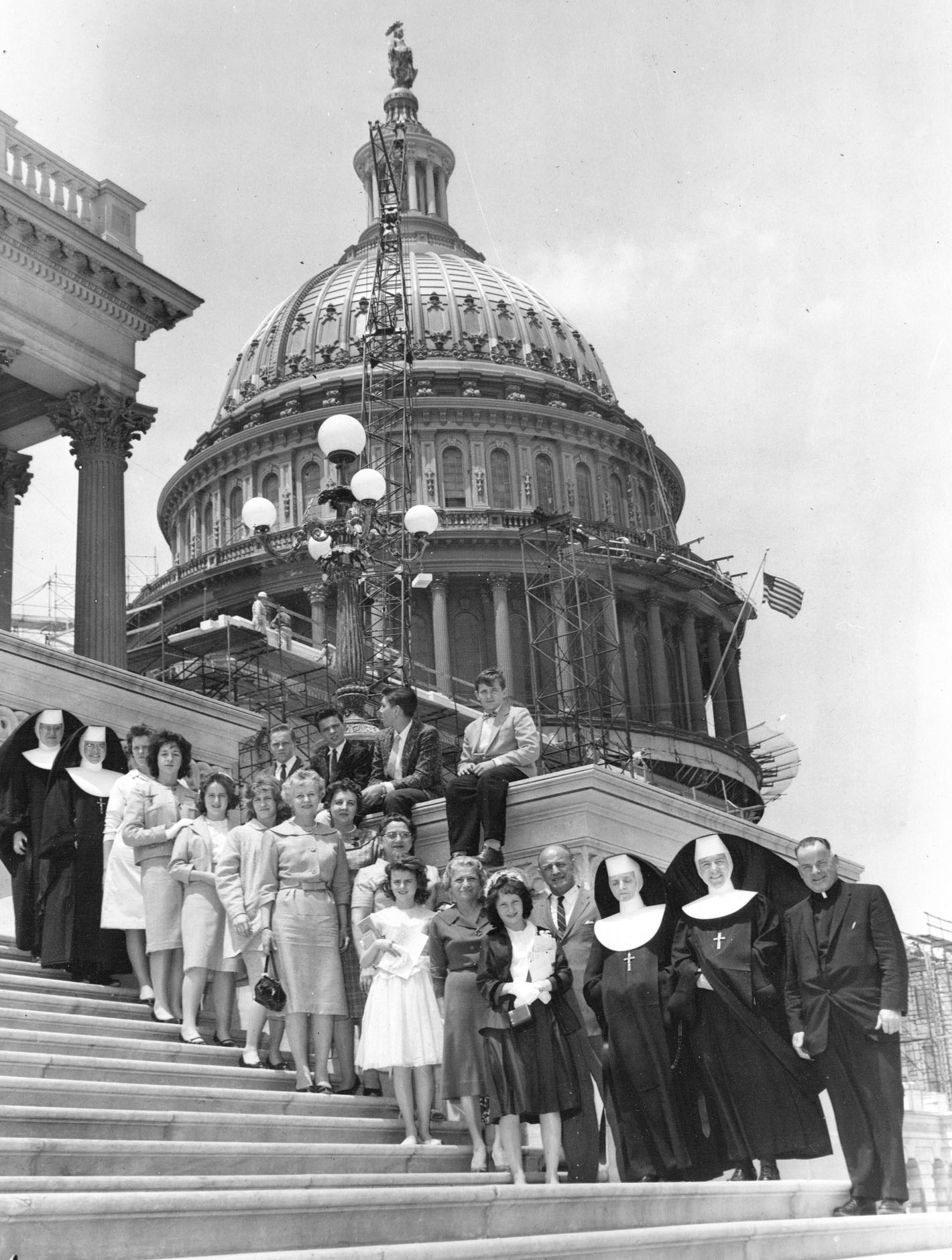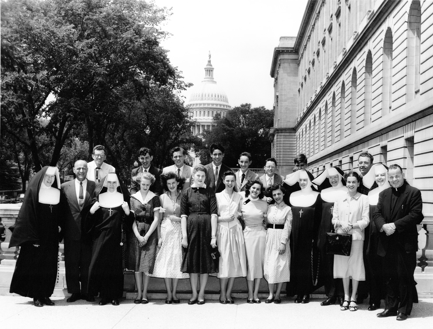 The 1960 graduates pose on the steps of the Nation's Capitol with Congressman Frank C. Osmers, Jr., of Tenafly. Pictured with the graduates and Osmers are Fr. George E. Byrne, four of the sisters, and Mrs. Henry J. Acanfora and Mrs. Theodore Farinella, who both were leaders in the St. Joseph's Guild.
