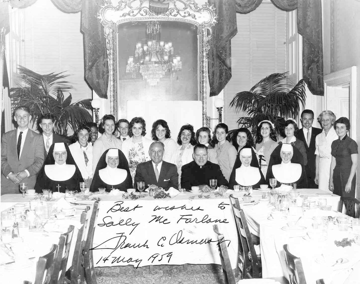 The 1959 graduating class was the first to graduate from St. Joseph's Village and they got to celebrate in Washington, D.C. at this dinner on May 14, 1959 Seated, Sr. Jarlath, Sr. Rose Imelda, Congressman Frank C. Osmers (autographed), Fr. George E. Byrne, Sr. Therese, and Sr. Concordia. Standing, Walter De Hon, Joe Kenny, Donna Mitchell, Pasquale Perez, Anna Kon????, Billy Macklin, Kathy Lewis, Pat Sullivan, Diana (last name unknown), Jeanne Cadman, Karen Marble, (Unidentified), Grace Boyle, Sally McFarlane and the last three unknown. PHOTO COURTESY OF SALLY'S McFARLANE'S SISTER KATHY McFARLANE.