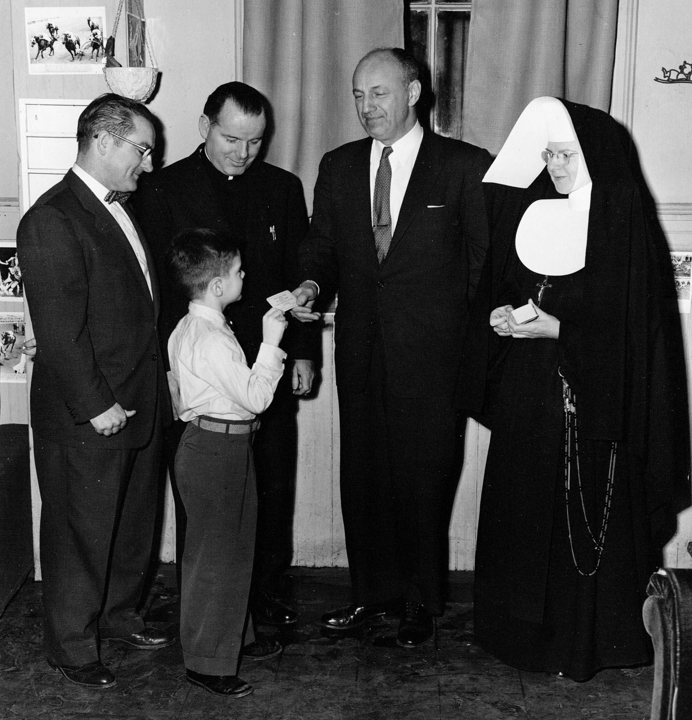 In this picture, dated Jan 1956, is on left, Joseph Carney, then city clerk of Englewood, NJ, officer of Midlantic/Citizens Bank, Chirman of Bergen County Republican Orginization. He was very active at St. Cecilia's R.C. Church in Englewood. Next is Fr. George E. Byrne, Congressman Frank C. Osmers, others unidentified. PHOTO BY DAVIDAN STUDIOS