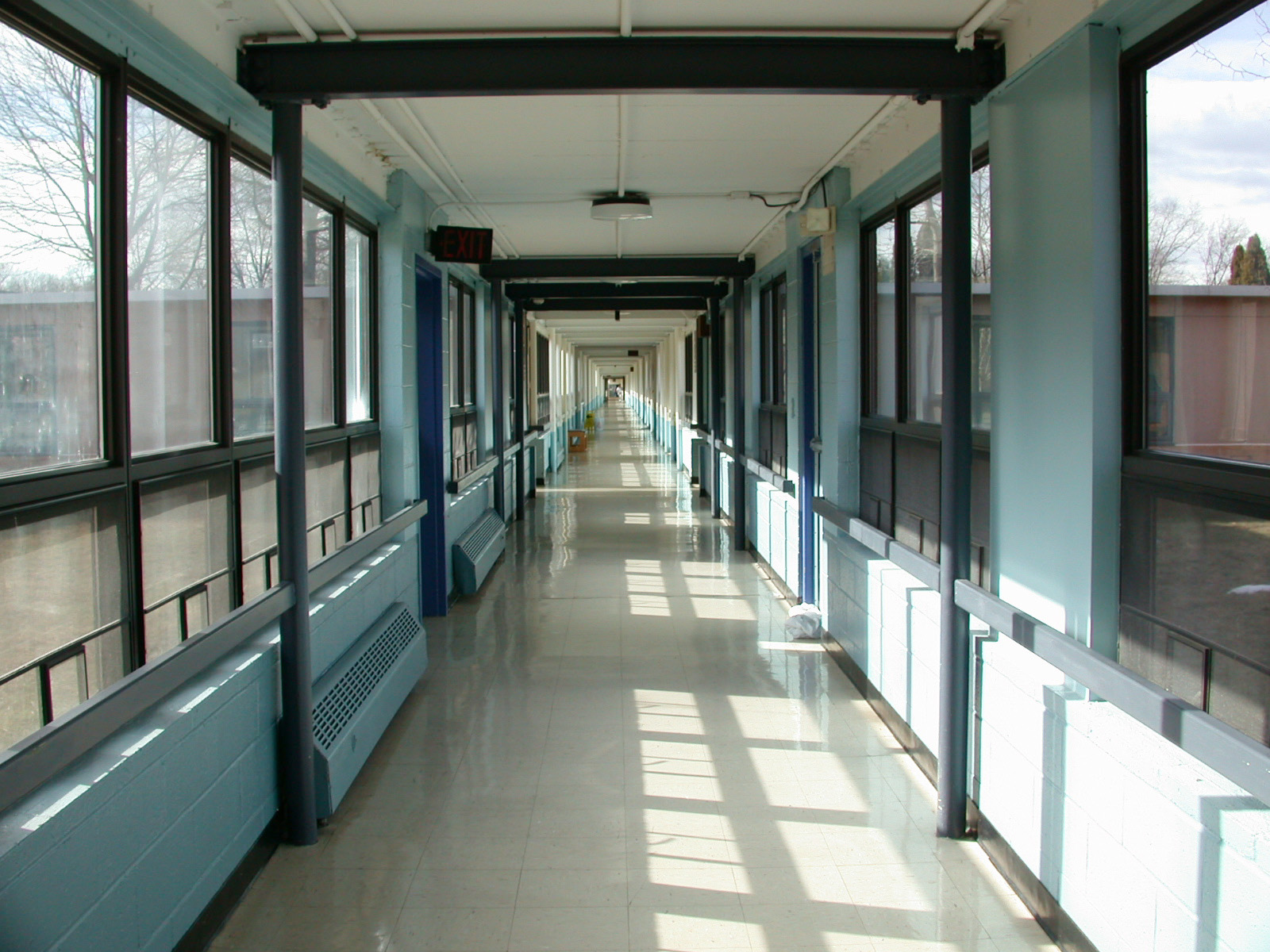 Looking down the main corridor from the girls end, we see that it has been changed in several ways. Most notably, the blue painted steel beams and lolly columns have been painted white in all but the girls end and the floors have been re-tiled differently in different segments of the corridor. The continuous unobstructed view from one end to the other is often blocked when the newly installed fire doors are closed at intervals along the corridor. The old drafty aluminum windows, like all the windows throughout the buildings, have been replaced with a modern thermal-panes. You can see a good shot of them in the photo on the front page of this Website. Space heaters have been placed at the ceiling in many places to provide much needed heat. Many conduits have been added along the ceilings for the new fire alarm system and power to new outside security lighting.