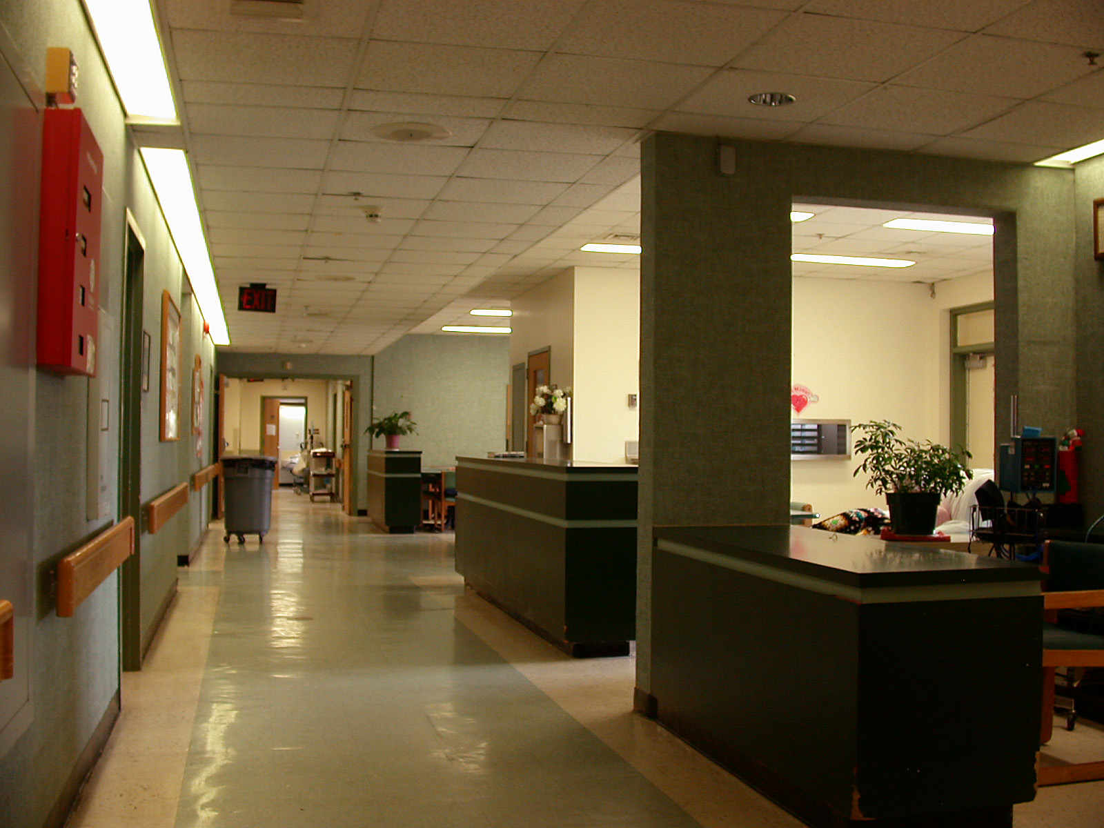 You would hardly know this was once the Senior Girl's Cottage! Major renovations of the interior were made. We are standing at the corridor door end of the cottage hallway. The right wall of the hall was removed along where you see the drop in the new ceiling. The door to the laundry room was at the first counter. The center counter is about where the bath and shower room was. The last counter is where the house mother's living quarters were. The room at the end of the hall replaces the vestibule leading to the outside. Along the left wall were the dormatories which are now divided into smaller patient rooms. The Intermediate Girl's and Junior Girl's Cottages were renovated likewise, each to accommodate 30 beds.