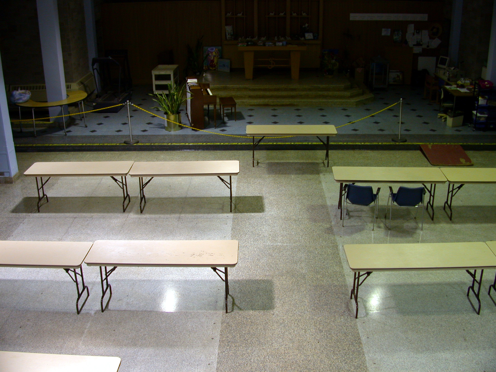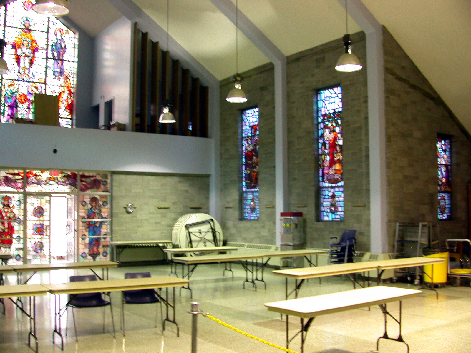 Except for the pews being replaced by tables and some recreation items in the sanctuary area, it almost looks as if Fr. McFarland is about to emerge to say Sunday Mass.