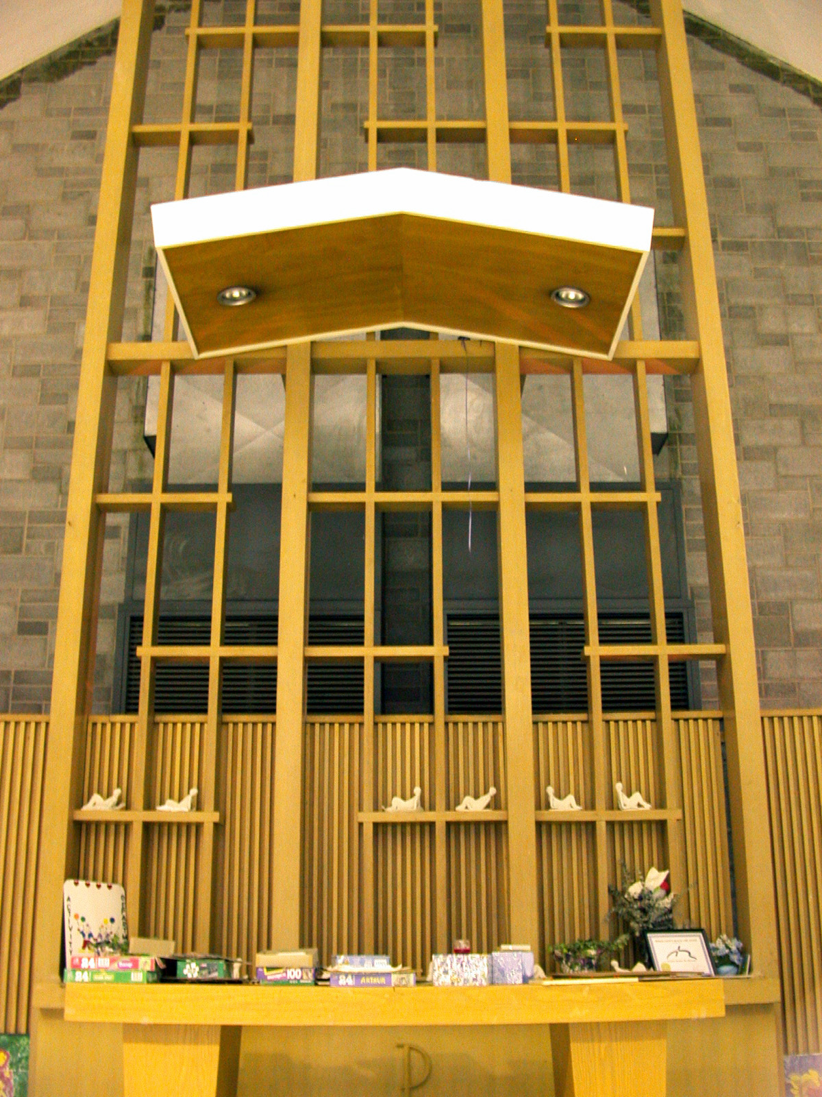 Off to the right side an original lighting chandelier can be seen. The confessional booths were also in that area. The lights in the main portion of the chapel have been replaced with high energy-efficiency type and are much brighter.