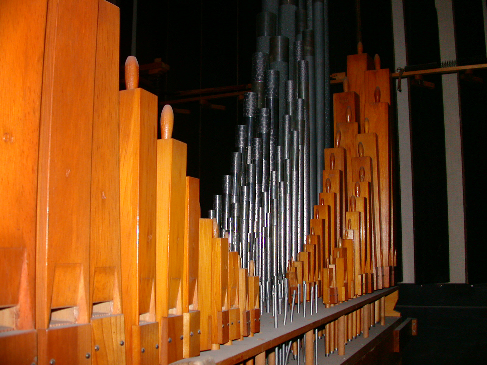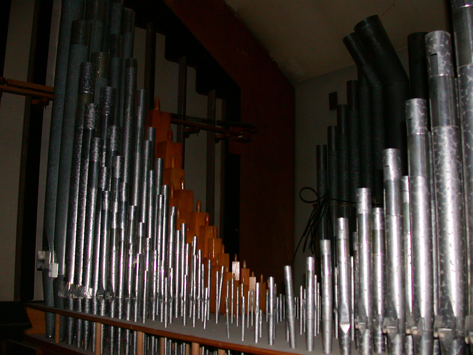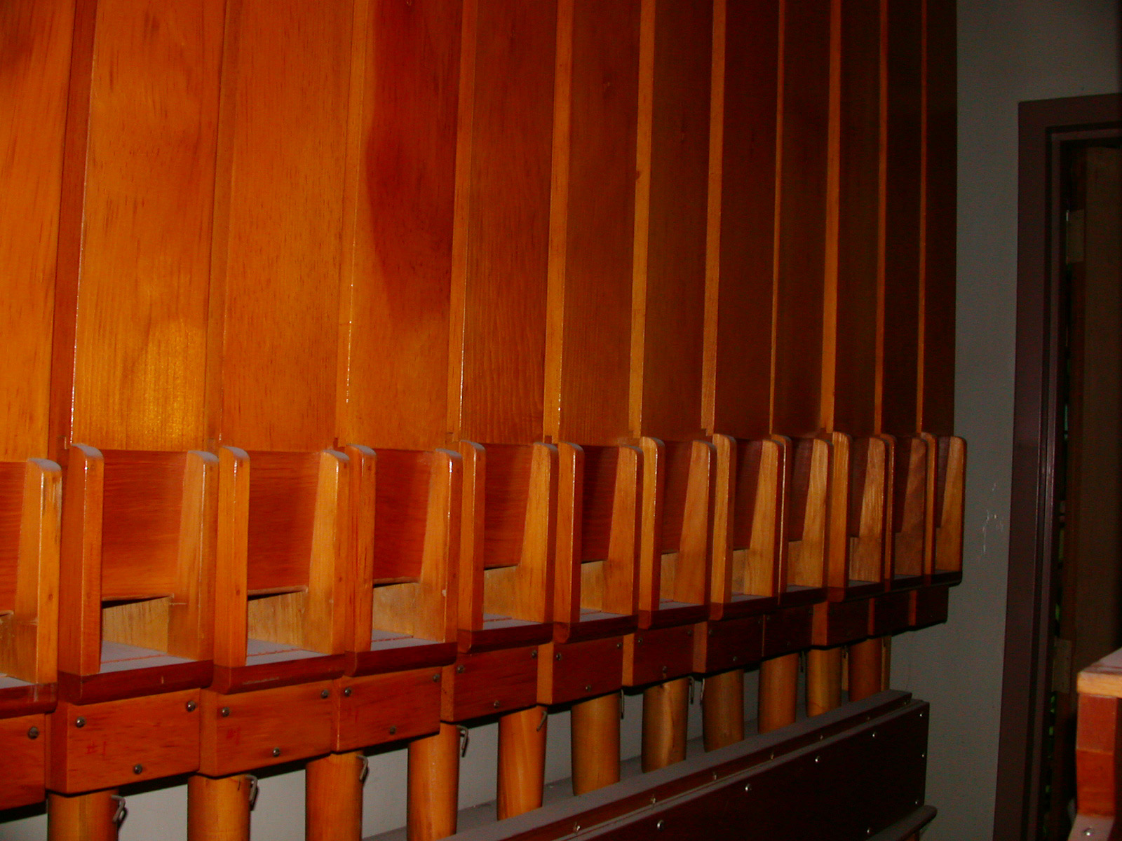 Several weeks after our tour, Hansen put me in touch with Bob Martin who later worked with me on making a few minor repairs and tuning to bring this organ to life again. A leak in the roof over the chamber caused plaster to drop into the DC power supply, so we made a temporary shroud over the power supply. We hope that the county will fix the roof and protect this memorable organ. (Update as of around 2020: Upon hearing of Bergen County vacating the buildings,John III and Frank Peragallo, of the Peragallo organ company who originally build and donated the organ, rescued the instrument from iminate doom and now have it in safe keeping in their Paterson, NJ factory.)