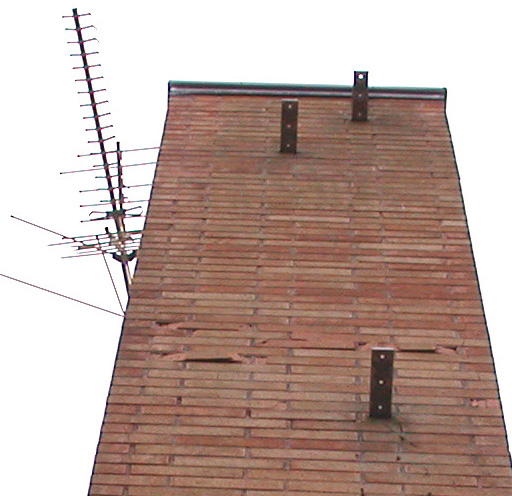 Three mounting brackets on the front of the bell tower once held the giant cross. Much of the brickwork is showing its age here and throughout the whole complex.