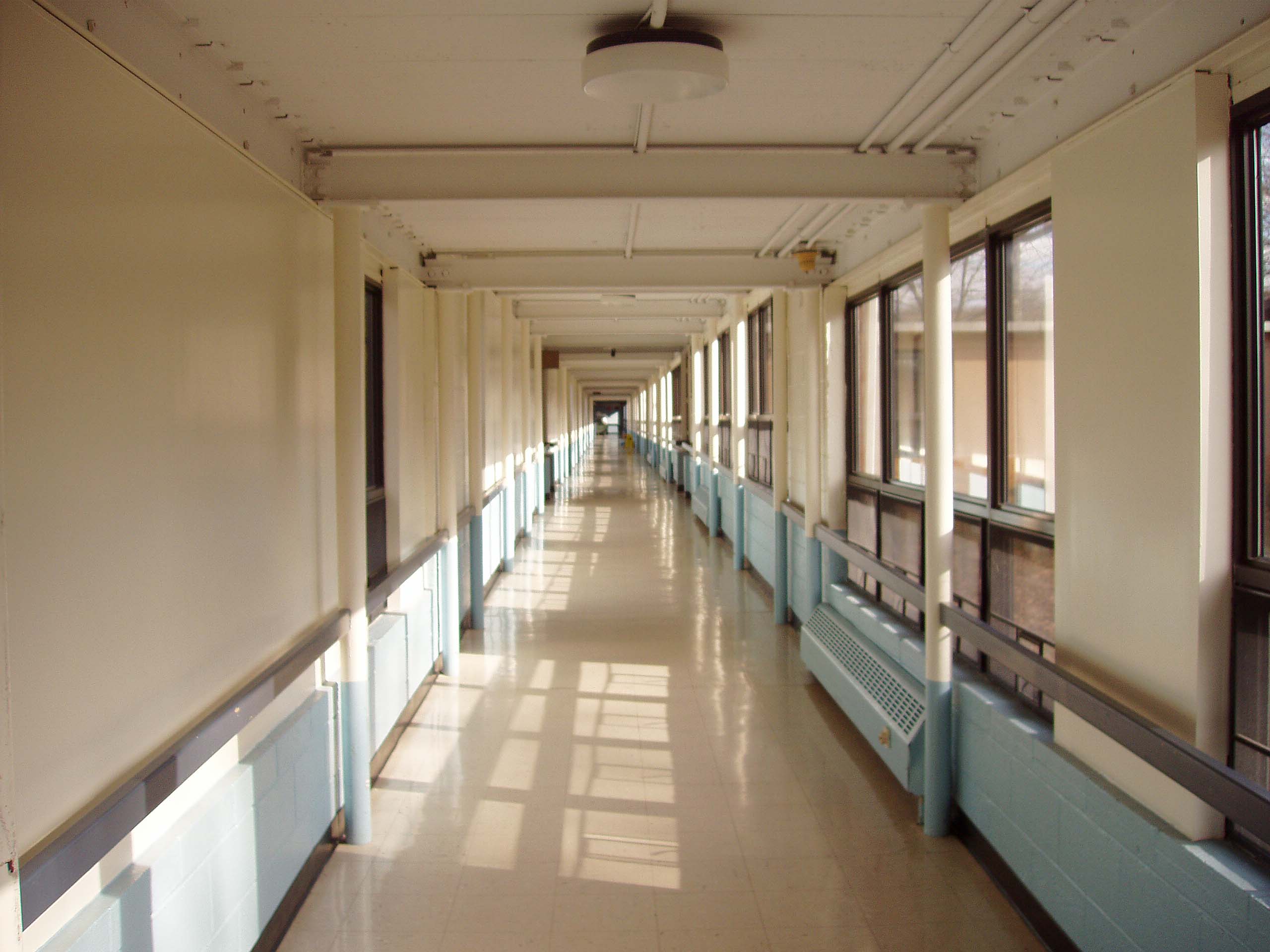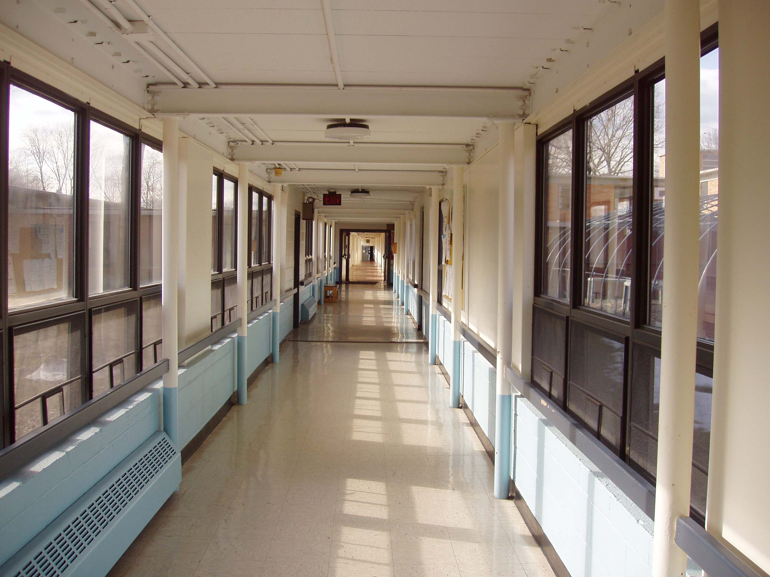 Here from the main corridor we see the playroom which now has some basketball equipment on its blacktop area.