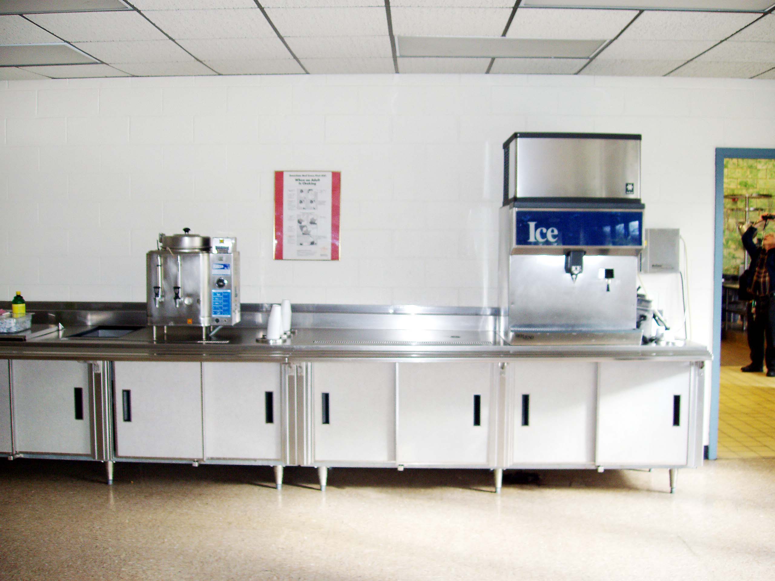 A larger industrial grade kitchen replaces the homestyle kitchenette.